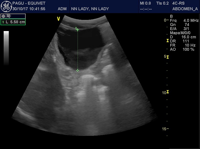 Foi iniciada terapia com cloridrato de betanecol 0.03 mg/ kg por via oral a cada 8 horas. Após este período, o potro iniciou a eliminação espontânea de urina, sendo a sonda removida (Imagens 2 e 3). Os casos de atonia vesical em potros e adultos normalmente são decorrentes de déficits neurológicos. No presente relato acredita-se que o cólon menor compactado e distendido determinou compressão do cólo vesical, impossibilitando seu esvaziamento e consequente distensão. A distensão prolongada resultou em lesão nervosa, comprometendo a contração vesical. Desta forma, sugere-se lesão nervosa temporária e reversível. A opção do uso do cloridrato de betanecol foi devido a sua ação sobre o reflexo destrusor e promotor de contração vesical . Posteriormente , o potro seguiu estável clinicamente, recebendo alta em 10 dias.